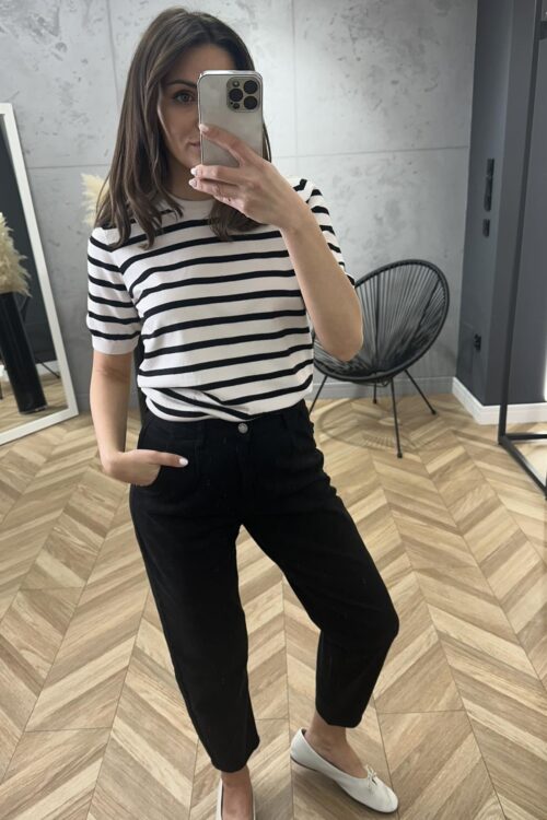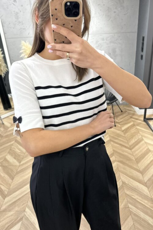 Sweterek śmiatankowy w czarne paski z kokardkami